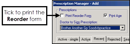To print a reorder form, tick Print Reorder Form on the Prescription Manager screen: