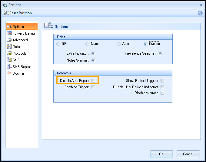 and select Settings (make sure you do not have a patient selected in Consultation Manager). From the options screen, deselect disable auto pop-up and select OK: