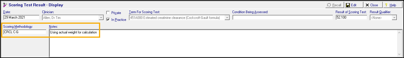 The appropriate clinical term and scoring methodology records in the patient's record: