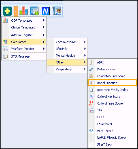 - From Consultation Manager, select Vision+ from the floating toolbar and select Calculators - Other - Renal Function: