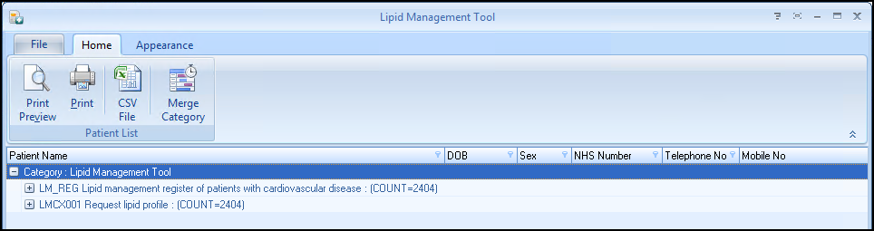 There is a comprehensive suite of pre-defined Lipid Management reports. From here you can manage your patients list, export to a CSV (spreadsheet) file or use the Vision+ Mail Merge facility to contact your patients.