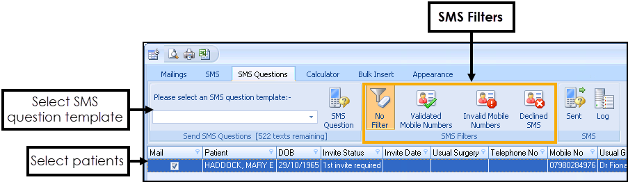 - Ensure you have enough texts available from the count in Send SMS Questions (nn Texts Remaining) and then select SMS Question