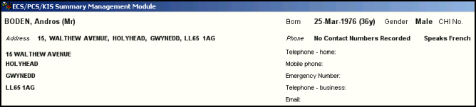 A patient demographic banner displays at the top of the ECS/PCS/KIS Summary Management screen. The banner initially displays the following: