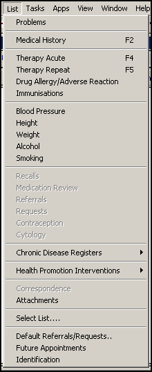 From the List menu you can display any of the following types of information providing it is recorded on the patient record. Inactive options indicate there is no data of that type recorded:
