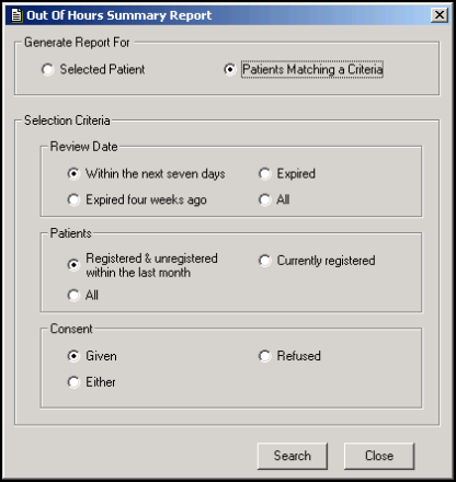 - The Out of Hours Summary Report displays, select Patients Matching a Criteria.