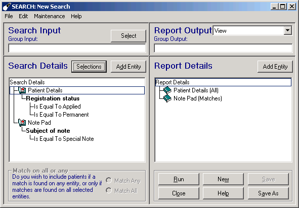 , Search: New Search displays.Note - To select Note Pad, select Add Entity - All Other Clinical Data - Miscellaneous - Note Pad. The Subject of Note must be typed in precisely.