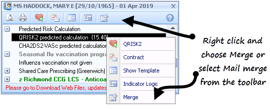 To perform a Mail/SMS Merge, highlight a line on the Alert popup screen and either right click and choose Merge or select Mail Merge