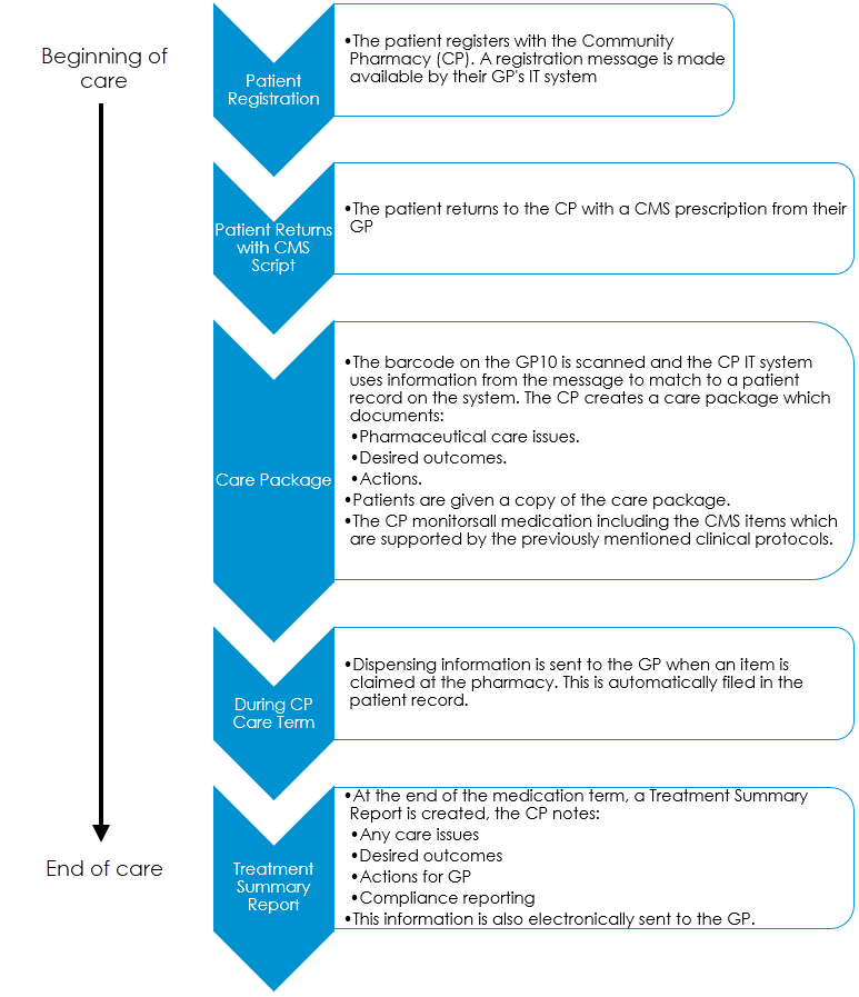 The following diagrams show the CMS workflow processes. They display the CMS cycle from a GP, Patient and Pharmacist perspective: