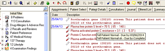 There is a Test Result Tool Tip option available from the Journal, Filtered and Problems views withinConsultation Manager. If you opt to switch the option on, when hovering your mouse pointer over a test result, a tool tip displays showing any Actions and their completion status associated with the result. This option is disabled by default but you can enable it from the Consultation Manager settings screen, see Consultation Manager Setup - General for details.