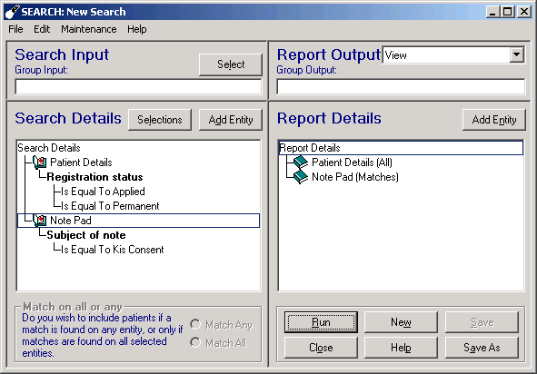 , Search: New Search displays.Note - To select Note Pad, select Add Entity - All Other Clinical Data - Miscellaneous - Note Pad. The Subject of Note must be typed in precisely.