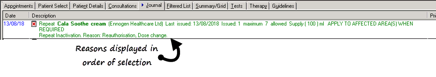 Inactivation and Reauthorisation Change Reasons are displayed in the order they were selected, followed by any additional comments indicated by <<text here>>. For a reauthorisation, the first reason is always Reauthorisation. Recorded reasons can be viewed from: