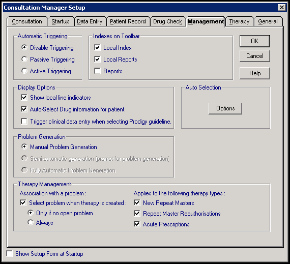 - Show Setup Form at Startup - Tick to show the Consultation Manager Setup form every time you access Consultation Manager. This is particularly useful for administration staff with a varied role within the practice.