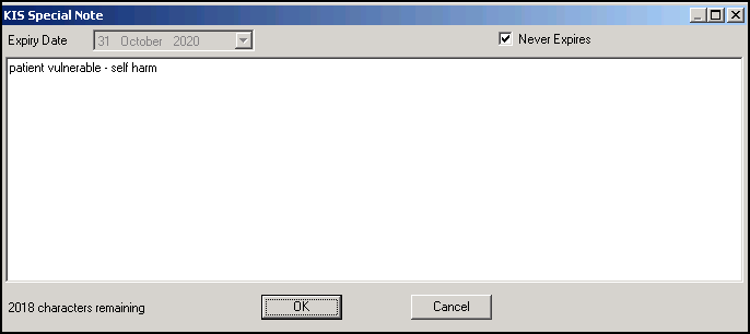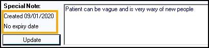 - Select OK to save. The creation and where recorded, the expiry date, display under the Special Note header: