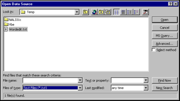 Now, return to the Open Data Source screen and, using Look in and by changing Files of type to Text Files, locate and highlight the wordedit.txt file: