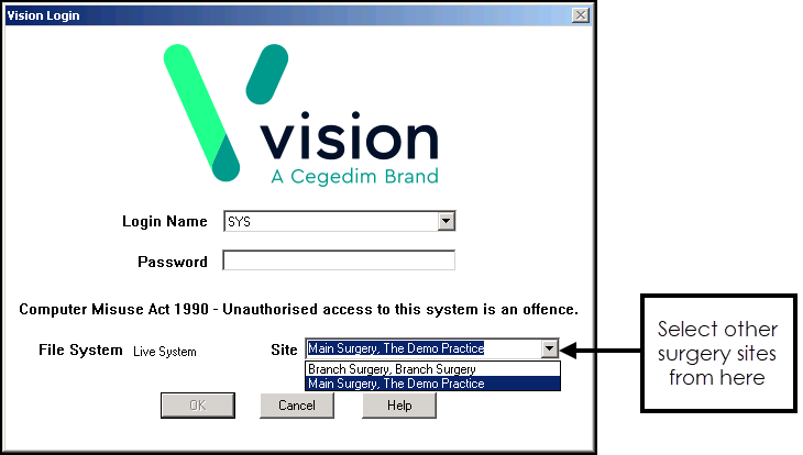 From the Vision 3 Login screen, select Site.