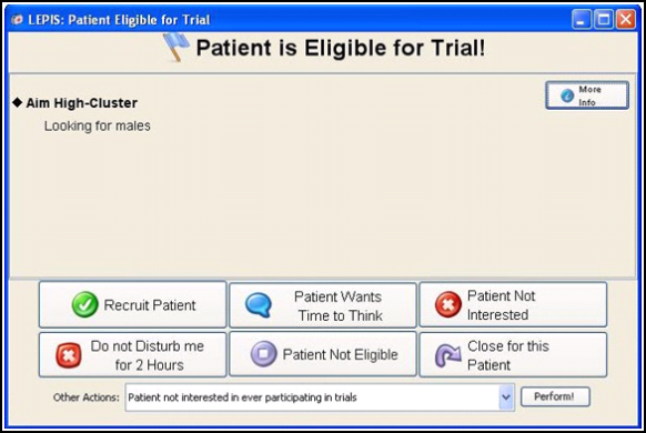 - The LEPIS:Patient Eligible for Trial screen displays.