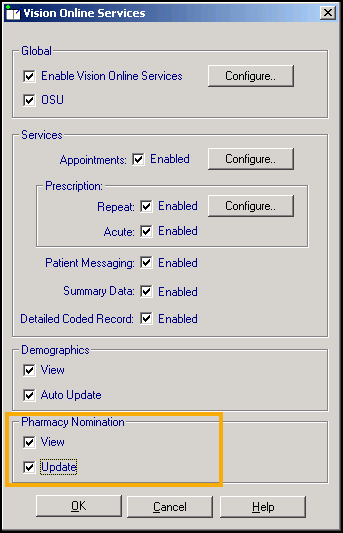 The View and Update (England only) Pharmacy Nomination is enabled by default.
