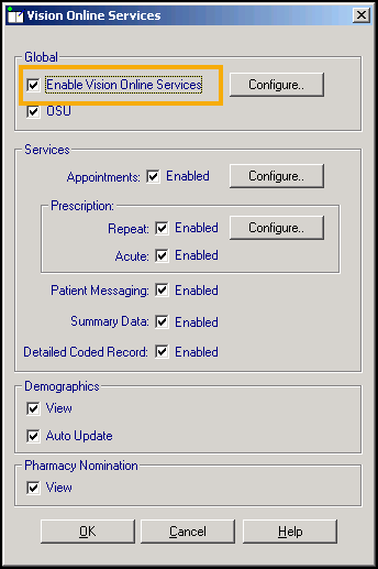 Online Services supports the online services practices offer to patients. The following sections in Control Panel on-screen help detail the setup of Enabling Online Appointments, Enabling Online Prescriptions, Enabling Patient Messaging, Enabling Summary Data and Enabling Detailed Coded Record .
