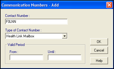 - The Add Contact Number option is now available, select Add Contact Number, enter a Contact Number and then select the appropriate Type of Contact Number.Important - For TP/HB/CSAs with which you have an electronic link, make sure to enter a Contact Number of Health Link Mailbox which consists of 5 alphanumeric characters, the HA or HB cipher followed by 1, 2 or 3 zeros, for example F0LDS for Leeds, which is the link to the address in GP Communicator for TP messages.