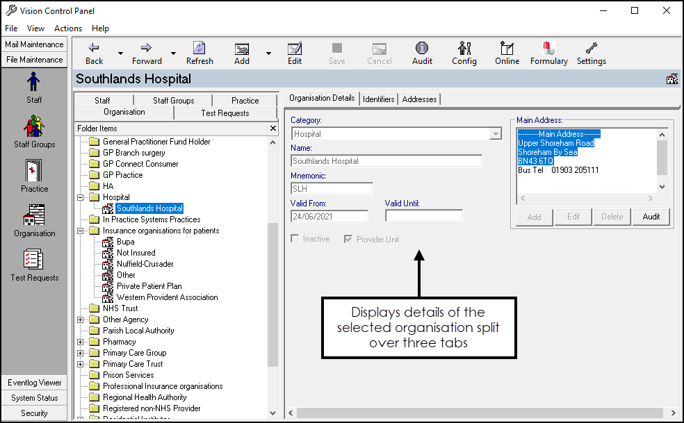 Organisation are set up in Vision 3 - Control Panel - File Maintenance for use throughout the system.
