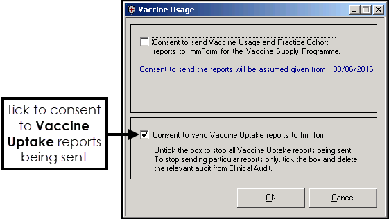 Practice consent is required for Vaccine Uptake reports to be sent to ImmForm. Consent to send Vaccine Uptake reports to Immform is the default, you therefore need to take now action unless you want to stop vaccine uptake reports being submitted.