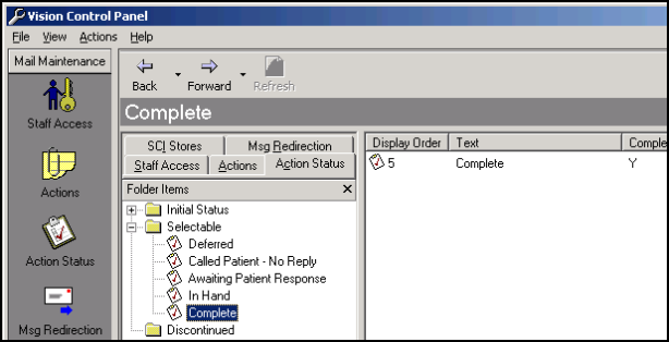Once an action is assigned to a message, see Actions for details, it can go through a number of stages prior to the action being marked as complete. At each stage, the responsible user may wish to update the status of the action. Such changes to the action status are coded in a similar way to action codes to render them searchable. An unlimited number of status codes may be defined by an individual practice although, in practice, the smaller the number, the more manageable the list.
