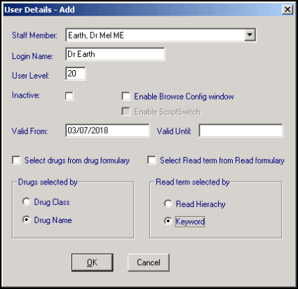 - Read term selected by - Select either Read Hierarchy, the codes themselves, or Keyword as the default way this user selects items from the Read Dictionary. You can switch between the two at the time of selection.