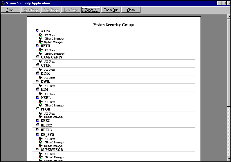 Vision Security Groups - You can print a list of current users and which groups they belong to. Right click within Current Users or the Groups of Users pane, select Print Preview and then Print.