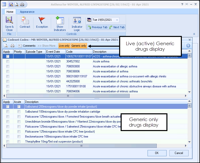 Some templates, for example, the Asthma QOF/QAIF screen allow you to select a drug. Generic drugs are listed by default.