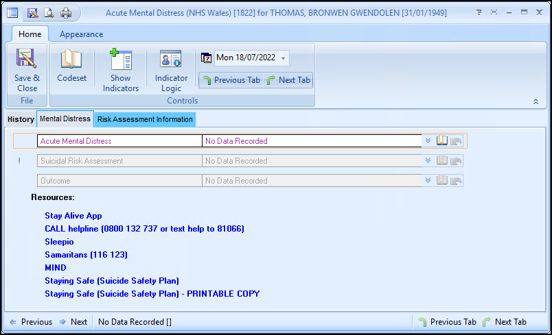 This clinical template is designed to meet GP contract requirements in Wales for practices to partake in a Clinical Quality Improvement initiative, which are also part of the Quality Assurance and Improvement Framework (QAIF). The Acute Mental Distress (NHS Wales) clinical template assists clinicians to record essential and optional information to assess a patient's acute mental distress.