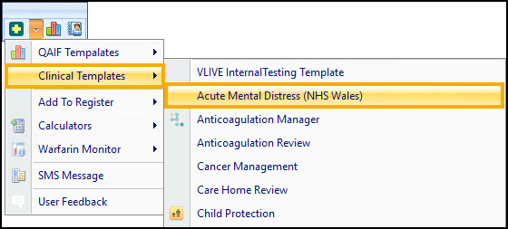 , select Clinical Templates and then select Acute Mental Distress (NHS Wales):