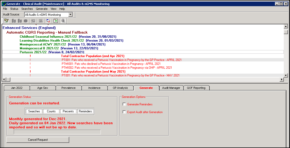 - If Generate displays in red, the statistics are due for generation, or there are new/updated audits.
