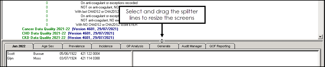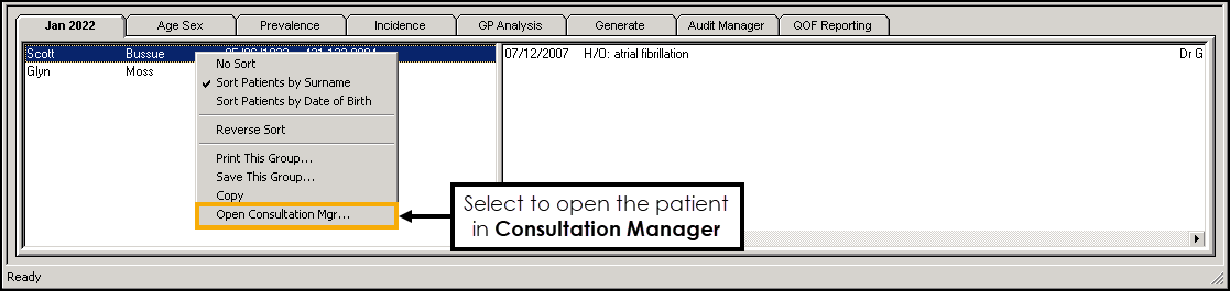 - Select an audit line to display the patients in the group, in the bottom left pane. Right click on a patient and select Open Consultation Mgr to open the patient's clinical record: