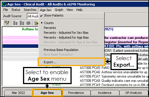 To export Age Sex results for an audit line, select the Age Sex tab to enable the Age Sex menu and select Export: