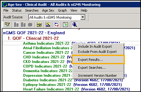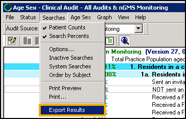To export all Clinical Audit statistics select Searches - Export Results: