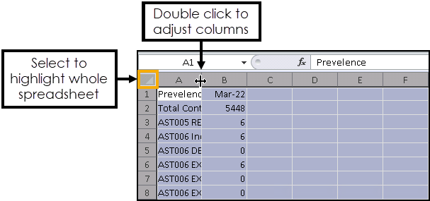 Training Tip - To quickly adjust the columns in the spreadsheet so that all data displays, select the corner and then double click on any boundary line between two columns:
