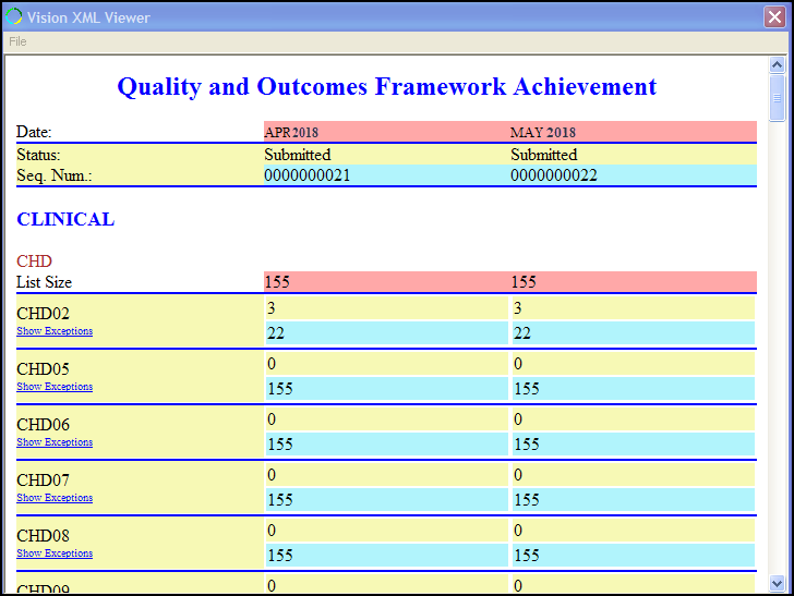 - From Clinical Audit, on the QOF Reporting tab, select Monthly - View Results. The XML Viewer displays the figures for the submitted report.