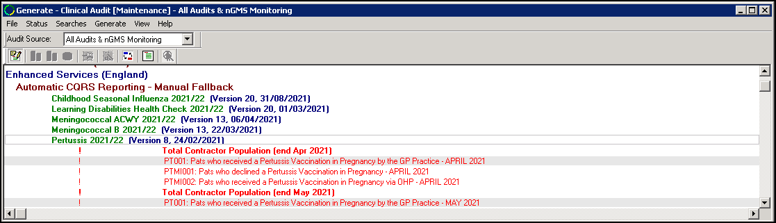 Select the Generate tab, a message displays 'Clinical Audit data generation can be restarted for [month/year]. Statistics were last generated for [month/year]. New searches have been imported and so will not be up to date'.