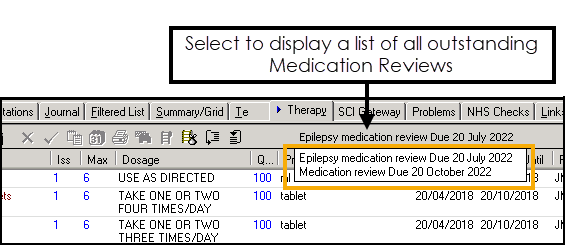 It is not unusual to have more than one outstanding Medication Review, for example, a general medication review and an epilepsy medication review. The Medication Review with the earliest due date is the one that displays on the Therapy screen toolbar, if the reviews are due on the same date, then the earliest entered record displays.