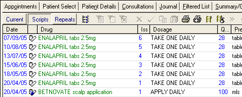 Repeat dispensing issue - one of the issues printed from a repeat dispensing prescription - viewed from the Scripts tab of Therapy.