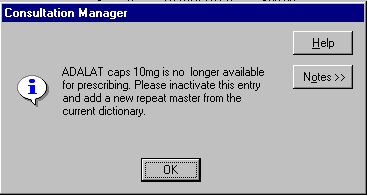 When there has been a drug dictionary change, and you right click on a repeat master and select Edit, you may see the message: [drug name] is no longer available for prescribing. Please inactivate this entry and add a new repeat master from the current dictionary.