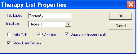 Right click on the Therapy tab and select View Options. This lets you rename the tab title, and to check an Initial Tab box if you want the initial display of this view to be at the Therapy tab.