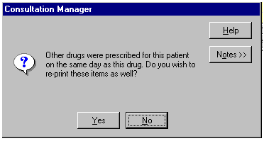 . - If there are other items with the same date, you will be prompted for reprints of all these items as well: Other drugs were prescribed for this patient on the same day as this drug. Do you wish to re-print these items as well? Answer either Yes or No.