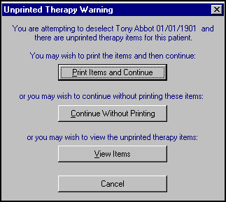 When a patient is de-selected, if there are any unprinted prescriptions, the Unprinted Therapy Warning screen displays: