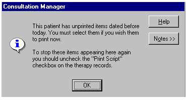 This patient has unprinted items dated before today. You must select them if you wish them to print now. To stop these items appearing here again, you should uncheck the Print Script checkbox on the Therapy records.