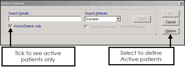 - List only active patients - Tick to have only active patients returned in your patient search, this includes those with permanent, applied, current temporary resident, emergency , special maternity and contraceptive registration statuses. In addition, it lists any patients specified in Options.