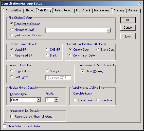 - Show Setup Form at Startup - Tick to show the Consultation Manager Setup form every time you access Consultation Manager. This is particularly useful for administration staff with a varied role within the practice.