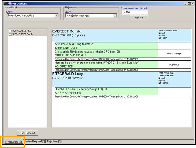 The Authorised tab in All Prescriptions only displays for prescribers. It lists patients and prescriptions marked for signing later. No action is required other than a quick confirmation and application of an electronic signature.
