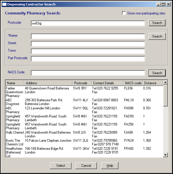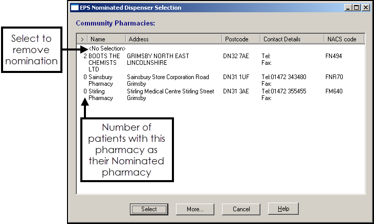 Once you have found the required dispensing contractor, highlight it and chose Select to save. Nominations are not stored in Vision 3. When a dispensing contractor is nominated, a Personal Demographics Service (PDS) update is sent to the NHS Spine.