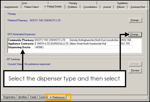 and then the Preferences tab. - Any existing nominations display in EPS Nominated Dispensers. To update or select a new dispensing contractor, highlight the EPS Nominated Dispensers type: